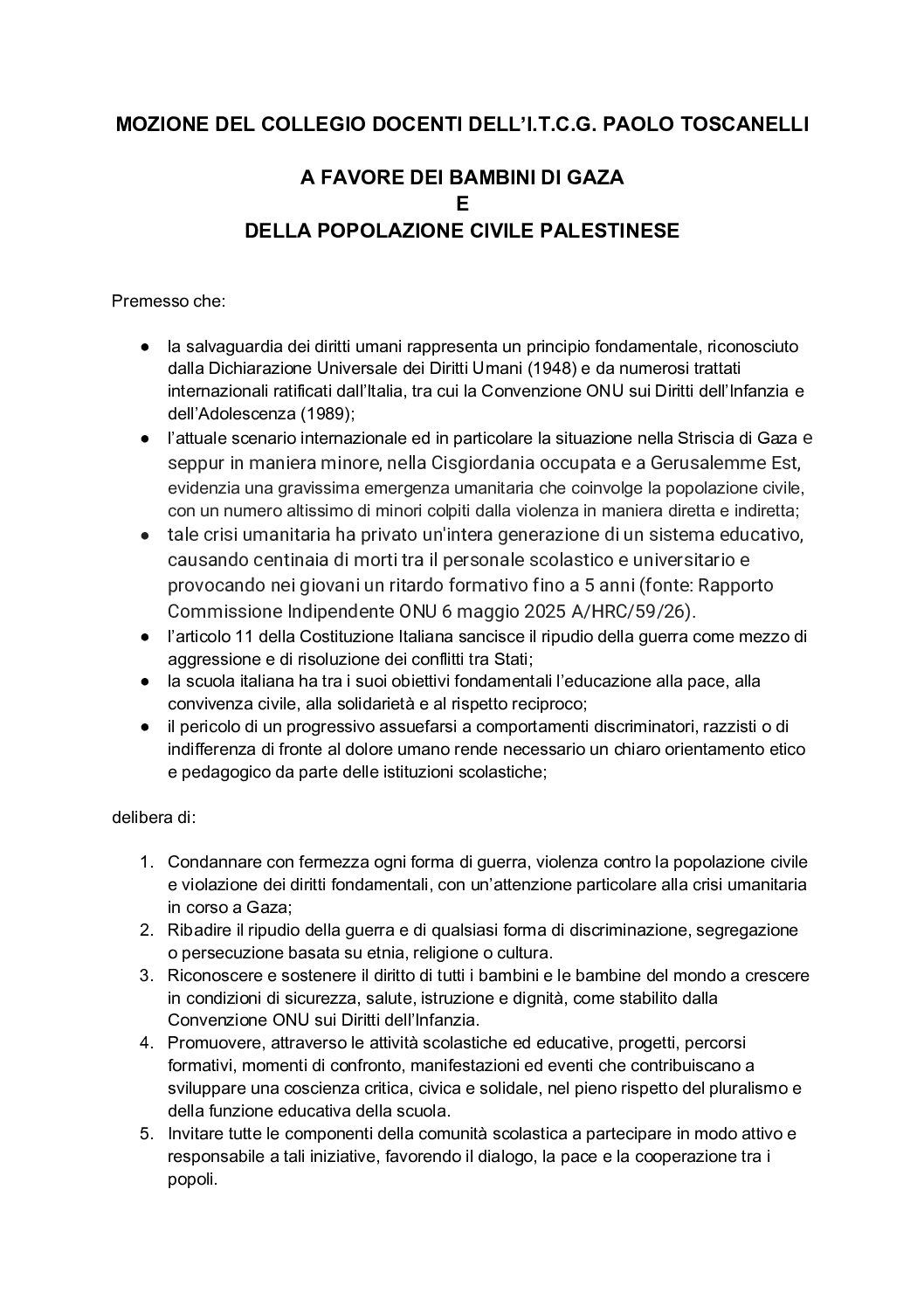 Lettera aperta dei docenti dell’istituto Toscanelli per i bambini di Gaza e la popolazione Palestinese